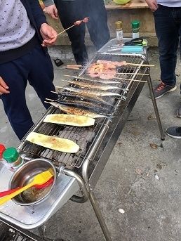 周末时间到了,大家提前购买了烧烤的食物、调料、饮料等。看到这么些好吃的东西,大家都迫不及待地开始洗菜、穿肉串、玉米……,有搬炉子的,有摆桌子的。炉子上摆满了要烤的肉、海鲜,滋滋冒着香味,负责烧烤的同事简直成了大厨,从炉子这头到那头,一边忙着给肉翻面,防止烤糊,还要撒调料、刷酱。